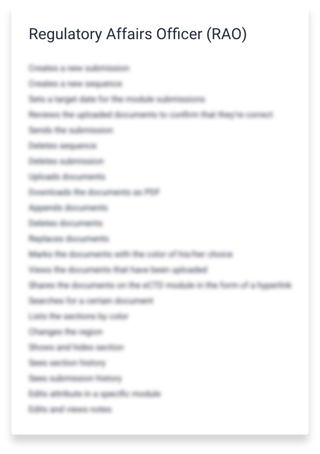 These 3 operations were categorized as “Business Requirements” for Regulatory Affairs Officers (RAO) alongside document management operations any Continuum user can perform.